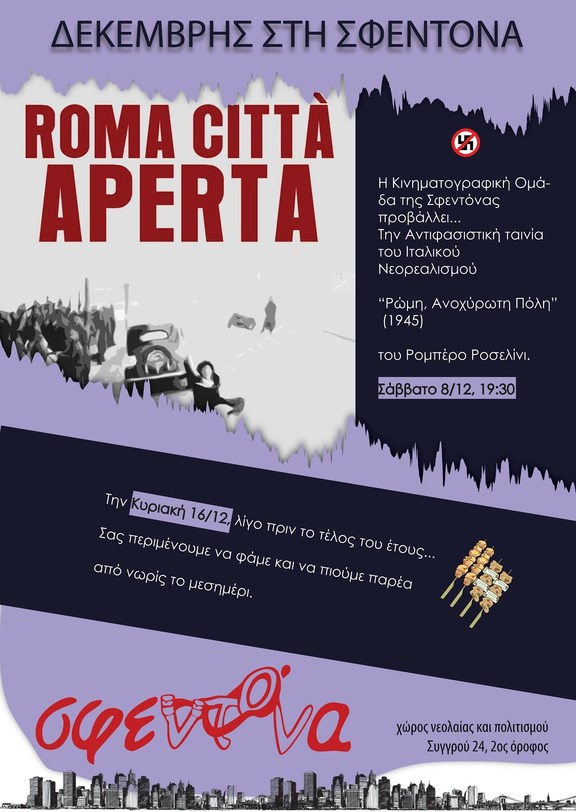 Το Πρόγραμμα Δεκέμβρη αλλάζει. Η σημερινή προβολή της ταινίας "Ρώμη, Ανοχύρωτη Πόλη" θα πραγματοποιηθεί το επόμενο Σάββατο 15/12 , στις 19:30.Σας περιμένουμε όλους στο Αντιφασιστικό Αφιέρωμα της Κινηματογραφικής Ομάδας της Σφεντόνας.Θα ακολουθήσει συζητήση.