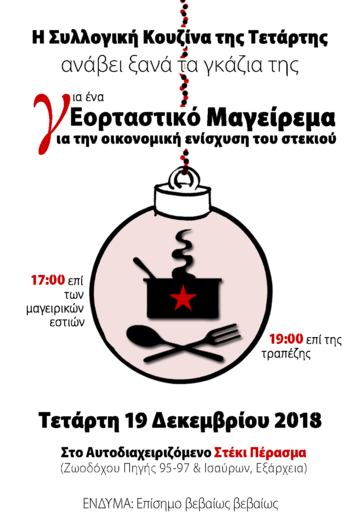 Για ακόμη μια φορά, η Συλλογική Κουζίνα της Τετάρτης ξαναμαζεύεται γύρω από τα καζάνια της για ένα εορταστικό μαγείρεμα με σκοπό την οικονομική ενίσχυση του στεκιού. Ελάτε στις 5 να μαγειρέψουμε μαζί, και κατά τις 7 να φάμε και να πλύνουμε τις κατσαρόλες μας.