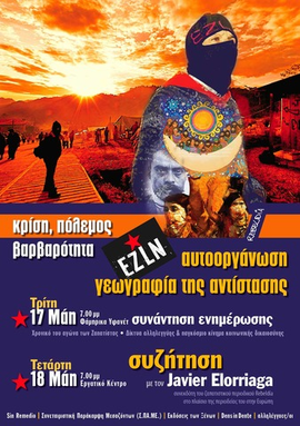 Μέσα στο κλίμα του "πολέμου κατά των ναρκωτικών" όπου το 2010 καταγράφηκαν 15.273 δολοφονίες στο Μεξικό, οι Ζαπατίστας, συνεχίζουν ν' αντιστέκονται στο πλιάτσικο και το θάνατο που σκορπά ο νεοφιλελευθερισμός οικοδομώντας συλλογικά την αυτονομία τους. Γι' αυτό το συλλογικό βηματισμό των αυτόνομων κοινοτήτων, 17 χρόνια από την εξέγερση τους, και την πολιτική κατάσταση στο Μεξικό θα έχουμε την ευκαιρία να συζητήσουμε με τον Χαβιέρ Ελοριάγα, συνεκδότη του ζαπατίστικου περιοδικού Rebeldia. Ο Χαβιέρ Ελοριάγα ήταν ο άνθρωπος που κάλυψε την εξέγερση των Ζαπατίστας τον Ιανουάριο του 1994 και συμμετείχε στις ειρηνευτικές συνομιλίες κατά τη διάρκεια των συγκρούσεων. Κατά την αναχώρηση του από τη ζούγκλα Λακαντόνα στις 9/2/1995 κατηγορήθηκε για τρομοκρατία και καταδικάστηκε σε φυλάκιση 13 ετών. Ο EZLN αποχώρησε από τις ειρηνευτικές συνομιλίες με την ομοσπονδιακή κυβέρνηση ως την απελευθέρωση του Ελοριάγα στις 6/6/1996