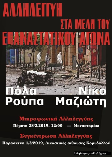 1) Μικροφωνική αλληλεγγύης στα μέλη του Ε.Α,28/2/19 12πμ στο Μοναστηράκι. 2) Κάλεσμα στο δικαστήριο φυλ.Κορυδαλλού,1/3/19,9:30πμ