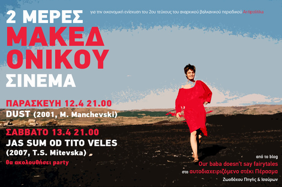 Το blog Our baba doesn't say fairytales διοργανώνει 2ημερο αφιέρωμα στο Μακεδονικό Σινεμά στο Αυτοδιαχειριζόμενο Στέκι Πέρασμα (Ζωοδόχου Πηγής και Ισαύρων, Εξάρχεια) με σκοπό την οικονομική ενίσχυση του 2ου τεύχους του αναρχικού βαλκανικού περιοδικού Antipolitika.
