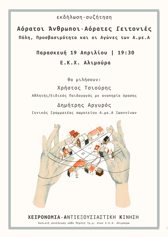 Εκδήλωση συζήτηση με τίτλο "Αόρατοι Άνθρωποι Αόρατες Γειτονιές. Πόλη, Προσβασιμότητα και οι Αγώνες των Α.με.Α" διοργανώνει η Χειρονομία - Α.Κ στον Ε.Κ.Χ Αλιμούρα στις 19 Απριλίου στις 7.30 το απόγευμα. Η πρόσβαση στον ελεύθερο κοινωνικό Αλιμούρα είναι δυνατή απο την Αραβαντινού 6 (εντός της στοάς Σκόρδου). Η πρόσβαση είναι πιο εύκολη από Τσιριγώτη 14 για άτομα με κινητικές δυσκολίες, ωστόσο είναι εφικτή και από Αραβαντινού 6, μέσω ανελκυστήρα εντός της στοάς.