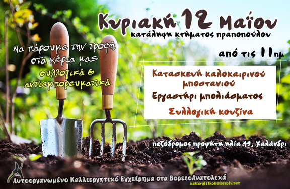 Την Κυριακή 12/5, από τις 11:00, θα πραγματοποιηθεί κατασκευή καλοκαιρινού μποστανιού και εργαστήρι μπολιάσματος. Στη συνέχεια θα ακολουθήσει συλλογική κουζίνα.