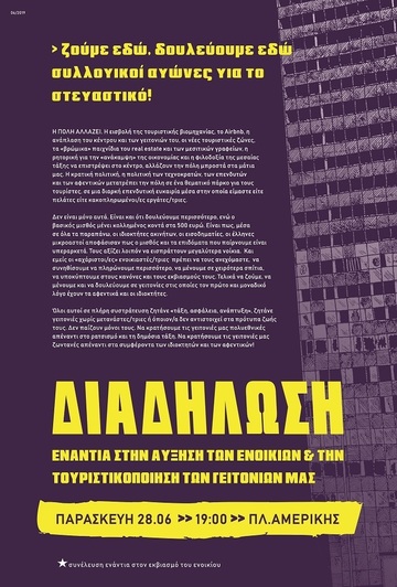 Στηρίζουμε και συμμετέχουμε στην πορεία "ενάντια στις αυξήσεις ενοικίων και την τουριστικοποίηση των γειτονιών μας", Παρασκευή 28/6, 19:00, στην Πλατεία Αμερικής που καλείται από την συνέλευση ενάντια στον εκβιασμό του ενοικίου. https://athens.indymedia.org/event/79690/