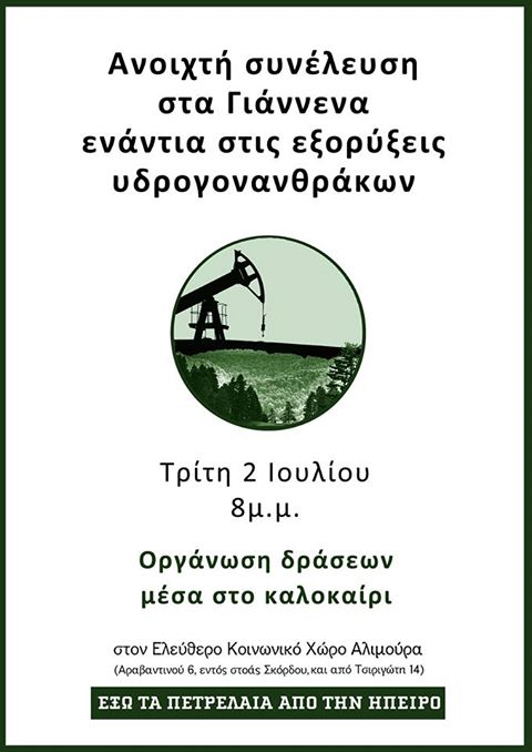Aνοιχτή συνέλευση στα Γιάννενα ενάντια στις εξορύξεις υδρογονανθράκων την Τρίτη 2/7 , στις 8μ.μ. στον Ε.Κ.Χ Αλιμούρα.