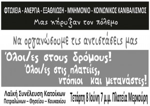 Ξαναπιάνοντας αυτό το νήμα που διατρέχει την μνήμη των κοινωνικών αγώνων στις περιοχές μας, αυτή την Τετάρτη 8 Ιουνίου στις 7 μ.μ. συγκαλείται Λαϊκή Συνέλευση Πετραλώνων - Θησείου - Κουκακίου, για να οργανώσουμε τις αντιστάσεις μας απέναντι στον κοινωνικό πόλεμο που μας έχουν κηρύξει, κυβέρνηση - αφεντικά -τραπεζίτες - Τρόικα.