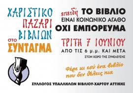 Επιλέγουμε να οργανώσουμε ΧΑΡΙΣΤΙΚΟ ΠΑΖΑΡΙ ΒΙΒΛΙΟΥ στην πλατεία Συντάγματος, ως κίνηση αντίστασης στη σημερινή πραγματικότητα του βιβλίου, ως κίνηση προβολής οράματος για την πραγματικότητα του βιβλίου που επιζητούμε.
