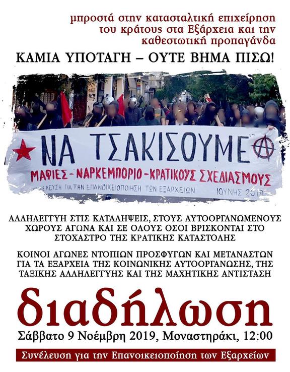 Σε αυτήν την κατεύθυνση στεκόμαστε αλληλέγγυοι σε κάθε αυτοοργανωμένη δομή και κάθε αγωνιστή που βρίσκεται αντιμέτωπος με την κρατική καταστολή και στηρίζουμε κάθε πρωτοβουλία που αναπτύσσεται με αγωνιστική αξιοπιστία και αξιοπρέπεια από τα κάτω απέναντι στην κρατική - καπιταλιστική βαρβαρότητα, πιστεύοντας πως όταν χτυπούν έναν από εμάς πρέπει να μας βρίσκουν όλους απέναντί τους. Καλούμε στη διαδήλωση το Σάββατο 9 Νοέμβρη, στις 12:00 μ. στο Μοναστηράκι, στην κατεύθυνση του χτισίματος ενός εξωστρεφούς πλατιού μετώπου αντίστασης στους σημερινούς κρατικούς σχεδιασμούς. Για την υπεράσπιση της ζωής, της αξιοπρέπειας, των αυτοοργανωμένων δομών, του ελεύθερου δημόσιου χώρου, της αγωνιστικής ιστορίας μας. Για τη διαμόρφωση των όρων της αυριανής κοινωνικής και ταξικής αντεπίθεσης.