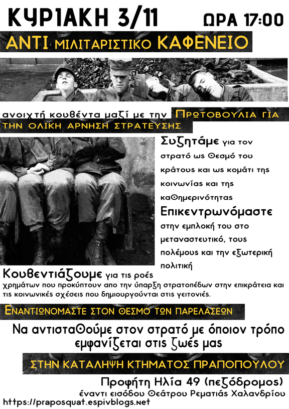 Σας περιμένουμε όλες και όλους την Κυριακή 3 Νοεμβρίου από τις 17.00 για το Αντι-μιλιταριστικό καφενείο και την ανοιχτή συζήτηση με την ομάδα «Πρωτοβουλία Ολικών Αρνητών Στράτευσης» στο Κτήμα Κατάληψης Πραποπούλου.