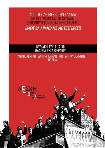 Καλούμε αγωνίστριες/στές, εργαζόμενες/νους, συλλογικότητες και σωματεία, πολιτικές οργανώσεις και συνδικαλιστικές παρατάξεις, μετωπικά σχήματα και στέκια, σε μαζική και μαχητική συμμετοχή στην αντιιμπεριαλιστική, αντιαμερικανική, αντικυβερνητική, αντιπολεμική, αντιφασιστική συγκέντρωση για την επέτειο της εξέγερσης του Πολυτεχνείου, την Κυριακή 17 Νοέμβρη στις 5:30 μ.μ. στην πλατεία Ρήγα Φεραίου και σε πορεία στο κέντρο της πόλης.