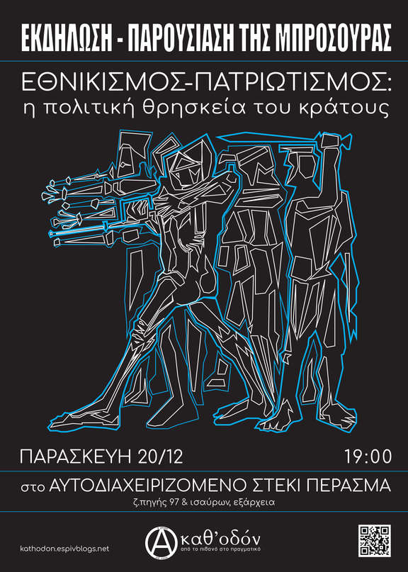 Την Παρασκευή 20/12, στις 7 μ.μ. στο αυτοδιαχειριζόμενο στέκι Πέρασμα θα πραγματοποιηθεί εκδήλωση - παρουσίαση της μπροσούρας «Εθνικισμός - Πατριωτισμός: η πολιτική θρησκεία του κράτους» της αναρχικής συλλογικότητας Καθ'οδόν. Η μπροσούρα διατίθεται με ελεύθερη συνεισφορά στο χώρο του στεκιού, και online σε pdf https://kathodon.espivblogs.net/files/2019/06… .