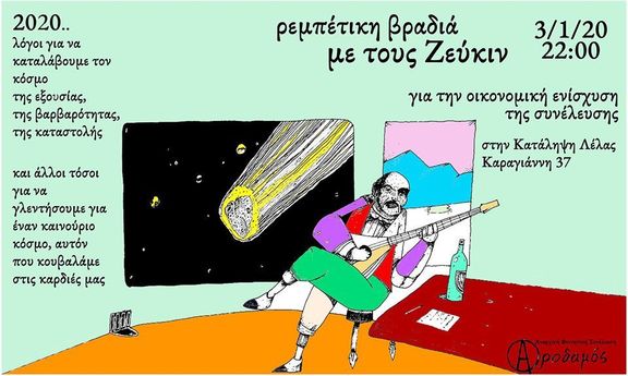 Την Παρασκευή 3/1/20 και ώρα 22:00 μμ, στην Κατάληψη Λέλας Καραγιάννη 37, ρεμπέτικη βραδιά με τους Ζεύκιν για την οικονομική ενίσχυση της συνέλευσης μας !