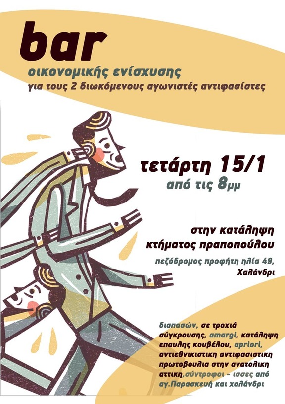 Την Τετάρτη 15/01 διοργανώνουμε μπαρ οικονομικής ενίσχυσης για τους 2 διοκώμενους αντιφασίστες για τις επιθέσεις στα γραφεία της Χρυσής Αυγής, από τις 20.00, στην κατάληψη κτήματος Πραποπούλου. Κατά τη διάρκεια του μπαρ θα υπάρχουν και κουπόνια οικονομικής ενίσχυσης.