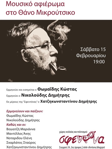 Το Στέκι Νεολαίας και Πολιτισμού Σφεντόνα, σας προσκαλεί στην Eκδήλωση-Aφιέρωμα στον μουσικοσυνθέτη Θάνο Μικρούτσικο, το Σάββατο 15 Φλεβάρη στις 7:00μμ.