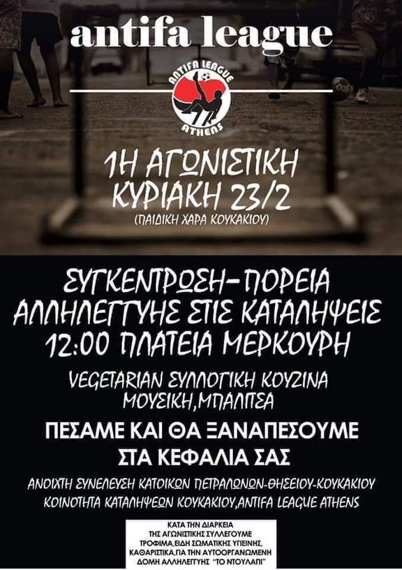 Το Antifa League Athens μαζί με την ανοιχτή συνέλευση κατοίκων Πετραλώνων-Θησείου-Κουκακίου και την κοινότητα καταλήψεων Κουκακίου, διοργανώνουν την 1η αγωνιστικη της αντιφασιστικης λιγκας οπου θα γινει και πορεια. Συγκέντρωση 12 το μεσημέρι στην πλατεία Μερκούρη (Άνω Πετράλωνα) και πορεία αλληλεγγύης (καταλήψεων), που θα καταλήξει στην παιδική χαρά στο Κουκάκι οπου θα ξεκινησει η αγωνιστική.