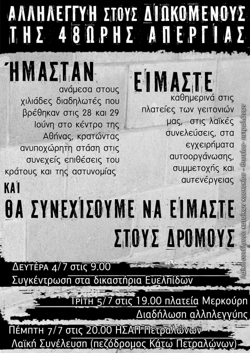 - ΤΡΙΤΗ 5/7 στις 19:00 Διαδήλωση αλληλεγγύης (πλατεία Μερκούρη)