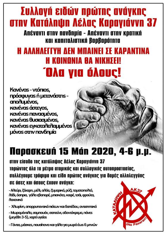 Συλλογή ειδών πρώτης ανάγκης στην είσοδο της Κατάληψης Λέλας Καραγιάννη 37 | Παρασκευή 15 Μάη 2020 | 16:00-18:00
