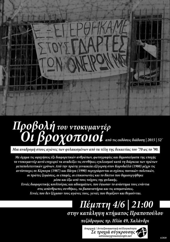 Στα πλαίσια αυτά, ενισχύοντας τις διάφορες πρωτοβουλίες και κινήσεις που οργανώνονται σε διάφορες πόλεις, διοργανώνουμε αυτήν την προβολή -από τις εκδόσεις Διάδοση- το οποίο συνοπτικά επιχειρεί, με όχημα τις αφηγήσεις 6 ανθρώπων, φωτογραφίες και δημοσιεύματα της εποχής, μια αναδρομή στους αγώνες των φυλακισμένων από τα τέλη της δεκαετίας του '70 έως το '90.