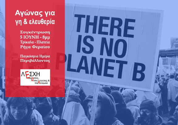 Στα πλαίσια της Παγκόσμιας Ημέρας Περιβάλλοντος (5 Ιουνίου), όπου σε όλα τα μέρη του πλανήτη θα πραγματοποιηθούν πολύμορφες κινητοποιήσεις, καλούμε και στην πόλη μας τον κόσμο της εργασίας και τη νεολαία, συλλογικότητες, σωματεία και εργατικά σχήματα, σε μαζική κινητοποίηση και συγκέντρωση στην πλατεία Ρήγα Φεραίου στις 8 μ.μ., την Παρασκευή 5 Ιούνη.