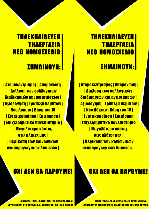 Έτσι με αφορμή την «έκτακτη ανάγκη» ο μισθός μας -άμεσος και έμμεσος- μειώνεται, ενώ τα κέρδη των αφεντικών αυξάνονται. Από πλευράς μας αρνούμαστε την εντατικοποιημένη τηλεκπαίδευση/τηλεργασία και κάθε είδους αξιολόγηση που άρχισαν να μας επιβάλλουν το κράτος-εργοδότης και τα αφεντικά με αφορμή την πανδημία και στο πλαίσιο της «έκτακτης ανάγκης». Απέναντι στις νέες τεχνικές πειθάρχησης που αποτρέπουν την όποια συλλογικοποίησή μας, εμείς θα ερχόμαστε η μία σε επαφή με τον άλλον και θα οργανώνουμε συλλογικές αντιστάσεις.