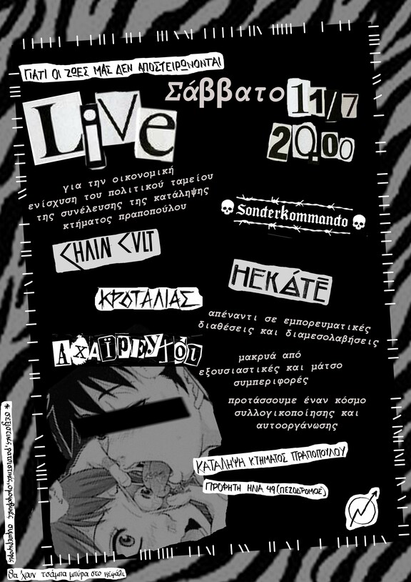 Σ' αυτή τη λογική επιλέγουμε να στήσουμε ένα punk live στο χώρο μας. Ένα live χωρίς μανατζαραίους και χορηγούς, χωρίς είσοδο, χωρίς πορτιέρηδες, όπου ο καθένας και η καθεμιά μπορεί να ακούσει μουσική και να αράξει μακρυά από εξουσιαστικές και κυριαρχικές συμπεριφορές. Γιατί για μας η μουσική είναι ένα αγαθό που δεν μεσολαβείται από το χρήμα και αποτελεί κτήμα όλης της κοινωνίας.