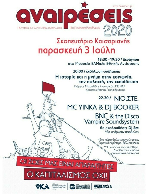 Σε έναν χώρο με ιδιαίτερο ιστορικό φορτίο συνεχίζουν το ταξίδι τους οι φετινές Αναιρέσεις. Στις μέρες μας η ιστορία γίνεται επίκεντρο της αστικής αφήγησης εν όψει των 200 χρόνων από το 1821, αναδεικνύοντας τη σημασία της στην ταξική αντιπαράθεση. Σε ένα τέτοιο χώρο, λοιπόν, επιλέγουμε να συζητήσουμε για το πώς η ιστορία και η συλλογική μνήμη επηρεάζουν τους κοινωνικούς και πολιτικούς αγώνες στο σήμερα. Ποια είναι τα κρισιμότερα διακυβεύματα και πού στοχεύει η επίσημη κρατική πολιτική για τους παραπάνω τομείς; Πιο συγκεκριμένα ποιος είναι ο ρόλος της εκπαίδευσης και πού στοχεύουν οι πιο πρόσφατες κυβερνητικές παρεμβάσεις όσον αφορά τη διδασκαλία της ιστορίας στα σχολεία; Ποια η στάση και η συμβολή των κομμουνιστικών δυνάμεων στις μάχες για την ιστορία και τη συλλογική μνήμη;