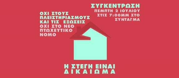 Συγκέντρωση στην πλατεία Συντάγματος για το δικαιώμα στη Στέγη, την Πέμπτη 2 Ιουλίου στις 7:00μμ