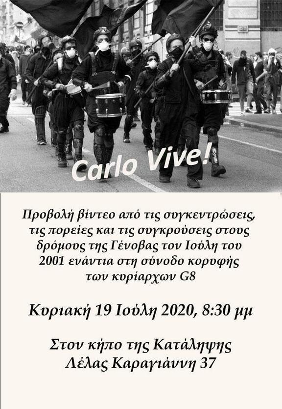Οι συγκλονιστικές μέρες στη Γένοβα τον Ιούλιο του 2001 είναι πια ιστορία. Μια αιματοβαμμένη ιστορία του αγώνα, σφραγισμένη για πάντα από τη δολοφονία του Carlo Giuliani από τους καραμπινιέρους, μάλλον άγνωστη σε πολλούς αφού πέρασαν σχεδόν 20 χρόνια από τότε. Για την υπενθύμισή της, παράλληλα με την προβολή βίντεο-ντοκουμέντων από τότε, αναδημοσιεύουμε ένα συνοπτικό χρονικό των γεγονότων στους γενοβέζικους δρόμους από την εξαντλημένη πια από χρόνια μπροσούρα GENOVA LIBERA 19-21 ΙΟΥΛΗ 2001, Ο ΕΞΕΓΕΡΤΙΚΟΣ ΑΓΩΝΑΣ ΕΝΑΝΤΙΑ ΣΤΗΝ ΠΑΓΚΟΣΜΙΑ ΚΥΡΙΑΡΧΙΑ ΚΑΙ ΤΗ ΡΕΦΟΡΜΙΣΤΙΚΗ ΔΙΕΘΝΗ, εκδόσεις Άνεμος