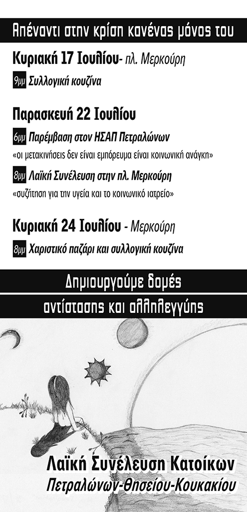 Απέναντι στην κρίση, ΚΑΝΕΝΑΣ ΜΟΝΟΣ/-Η Δημιουργούμε δομές αντίστασης και αλληλεγγύης, συναντίομαστε και συζητάμε για το ζήτημα της υγείας και για την προοπτική δημιουργίας κοινωνικού ιατρείου στις περιοχές μας