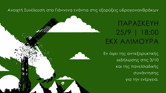 Ανοιχτή συνέλευση στα Γιάννενα ενάντια στις εξορύξεις υδρογονανθράκων, την Παρασκευή 25/9 , 18:00, στον ΕΚΧ Αλιμούρα (Ελεύθερος κοινωνικός χώρος Αλιμούρα) , εν όψει της αντιεξορυκτικής εκδήλωσης στις 3/10 και της πανελλαδικής συνάντησης για την ενέργεια.