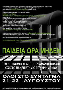 "Μέσα στο καλοκαίρι και με συνοπτικές διαδικασίες η κυβέρνηση προωθεί για ψήφιση στη βουλή, νομοσχέδιο που κατεδαφίζει την ανώτατη εκπαίδευση. Η πανεπιστημιακή κοινότητα αντιδρά και απαιτεί να αποσυρθεί τώρα το νομοσχέδιο Η πρωτοβουλία πανεπιστημιακών ενάντια στο πανεπιστήμιο του μνημονίου, σε συνεργασία με τη συνέλευση της πλατείας Συντάγματος διοργανώνει διήμερο κινητοποιήσεων στο Σύνταγμα." επισημαίνουν σε ανακοίνωση τους.