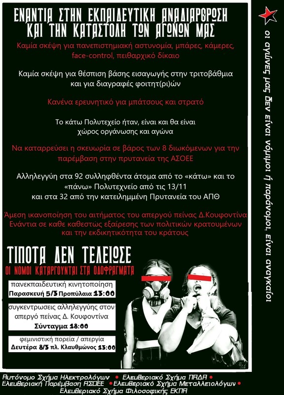 Κάλεσμα στην πανεκπαιδευτική κινητοποίηση 5/3, συγκεντρώσεις αλληλεγγύης Δ.Κουφοντίνα, φεμινιστική πορεία/απεργία 8/3