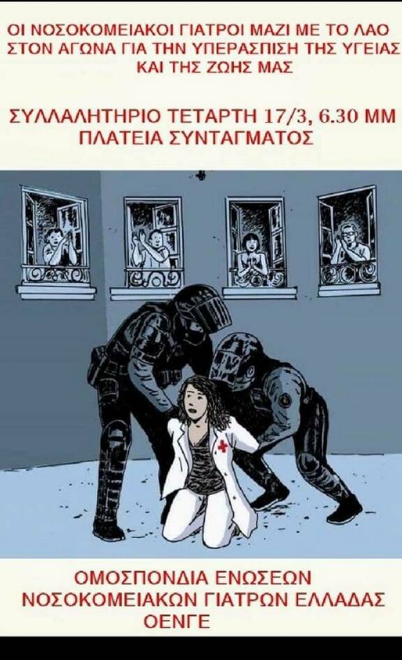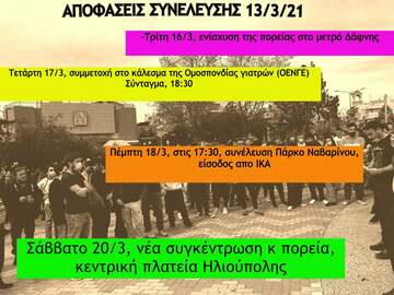 «Καλούμε σε πλατιά μαζική λαϊκή κινητοποίηση την Τετάρτη 17/3/2021 στο Σύνταγμα στις 18:30, με σκοπό να πορευτούμε και να συναντήσουμε τους αγωνιζόμενους γιατρούς της ΟΕΝΓΕ για την υπεράσπιση της δημόσιας υγείας, τα συνδικάτα, τα σωματεία και τις ομοσπονδίες και κλάδους που κινητοποιούνται και αυτοί ενάντια στην κυβερνητική διαχείριση της πανδημίας, με αίτημα τη γενναία ενίσχυση του ΕΣΥ και την προστασία της υγείας του λαού, ενάντια στην καταστολή και την εργοδοτική τρομοκρατία, ενάντια στον αυταρχισμό και την κλιμακούμενη αστυνομική βία».