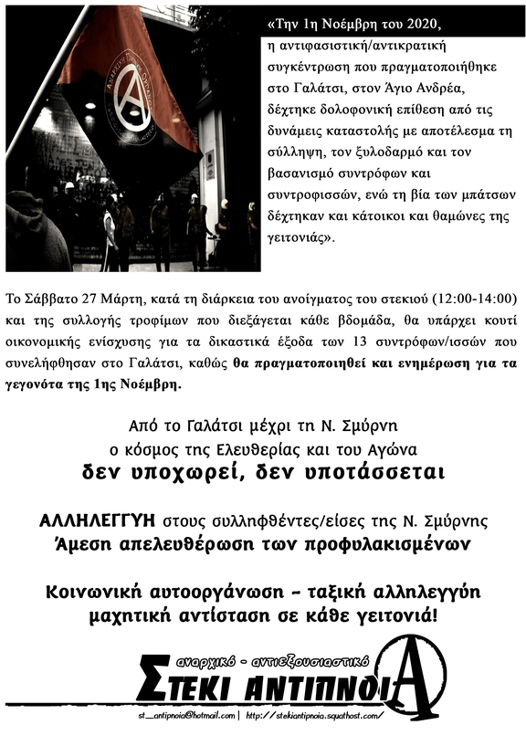 Το Σάββατο 27 Μάρτη, κατά τη διάρκεια του ανοίγματος του στεκιού (12:00 - 14:00) και της συλλογής τροφίμων που διεξάγεται κάθε βδομάδα, θα υπάρχει κουτί οικονομικής ενίσχυσης για τα δικαστικά έξοδα των 13 συντρόφων/ισσών που συνελήφθησαν στο Γαλάτσι, καθώς θα πραγματοποιηθεί και ενημέρωση για τα γεγονότα της 1ης Νοέμβρη.