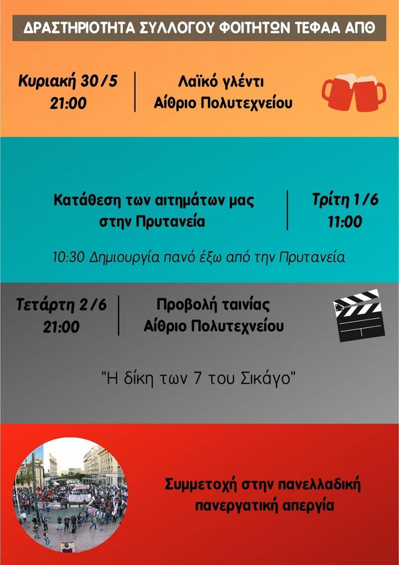 Μετά από απόφαση της Γενικής του Συνέλευσης, ο Σύλλογος Φοιτητών ΤΕΦΑΑ ΑΠΘ προχωρά σε πλούσια δραστηριότητα την επόμενη εβδομάδα:
