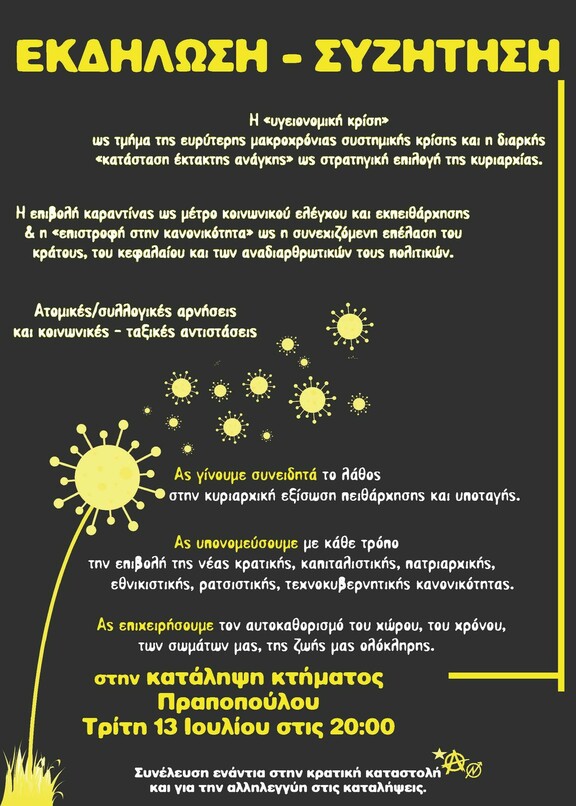 Η «υγειονομική κρίση» ως τμήμα της ευρύτερης μακροχρόνιας συστημικής κρίσης και η διαρκής «κατάσταση έκτακτης ανάγκης» ως στρατηγική επιλογή της κυριαρχίας.Η επιβολή καραντίνας ως μέτρο κοινωνικού ελέγχου και εκπειθάρχησης & η «επιστροφή στην κανονικότητα» ως η συνεχιζόμενη επέλαση του κράτους, του κεφαλαίου και των αναδιαρθρωτικών τους πολιτικών. Ατομικές/συλλογικές αρνήσεις και κοινωνικές-ταξικές αντιστάσεις.