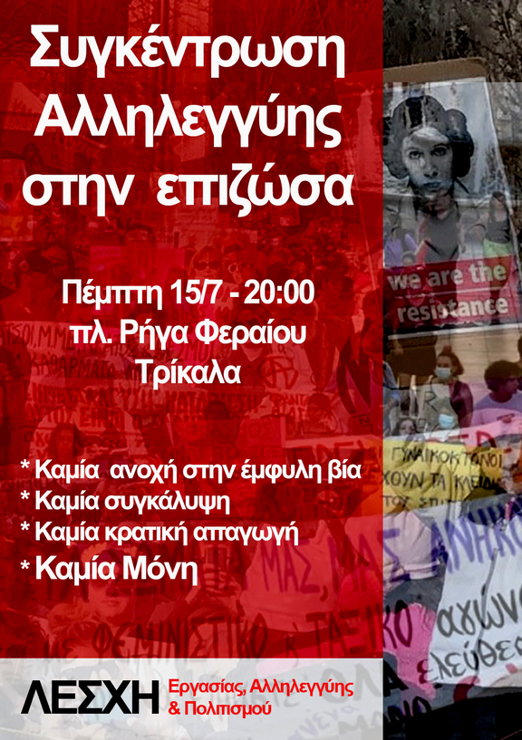 Καλούμε τους εργαζόμενους και τις εργαζόμενες, τη νεολαία, τις συλλογικότητες και τα σωματεία, να ενώσουμε τις φωνές μας ενάντια στις γυναικοκτονίες, την κουλτούρα του βιασμού και την πατριαρχία, στην πλατεία Ρήγα Φεραίου την Πέμπτη 15 Ιούλη στις 8 μ.μ.