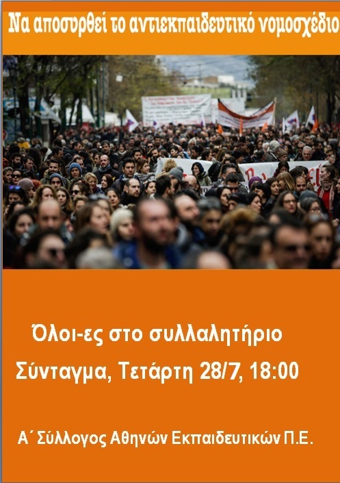 Α΄ Σύλλογος Αθηνών: Όλοι-ες στο συλλαλητήριο ενάντια στο αντιεκπαιδευτικό νομοσχέδιο - ΤΕΤΑΡΤΗ 28 ΙΟΥΛΙΟΥ ΣΤΙΣ 6μ.μ. ΣΤΟ ΣΥΝΤΑΓΜΑ