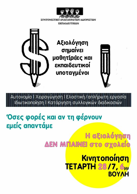 Κάτω το νέο αντι-εκπαιδευτικό νομοσχέδιο - Καμία αξιολόγηση ποτέ και πουθενά - Όχι στην «αυτονομία» των σχολείων