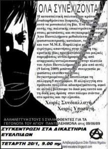 Συγκέντρωση αλληλεγγύης στους 5 διωκόμενους/ες συντρόφους/ισσες των γεγονότων της 9/6/2009 του Αγ.Παντελεήμονα