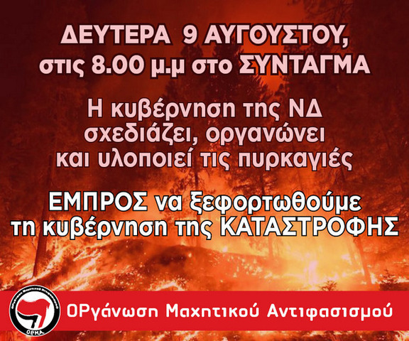 Κάλεσμα σε συγκέντρωση διαμαρτυρίας την Δευτέρα 9/8 στις 8μμ στο Σύνταγμα. Να διώξουμε την κυβέρνηση των ενόχων για τις καταστροφικές πυρκαγιές.Αλληλεγγύη στους πυρόπληκτους
