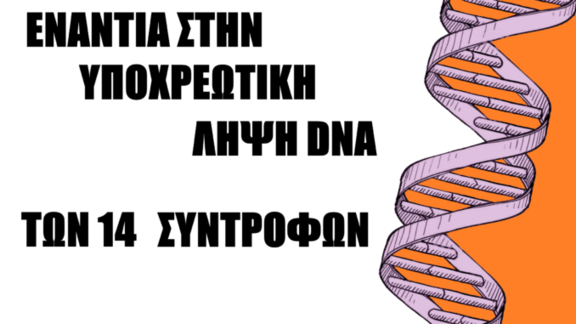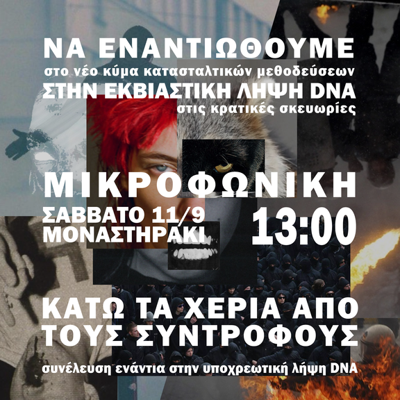 Γνωρίζουμε πολύ καλά ότι τα δόγματα ασφάλειας-τάξης και μηδενικής ανοχής είναι αιχμέςτου κράτους στον συνεχή πόλεμο που εξελίσσεται, και ότι στα πλαίσια αυτού δεν πρόκειταινα κρατήσει κανένα πρόσχημα. Για αυτό και οι σύντροφοί μας, βρίσκονται μπροστά στην υποχρεωτική λήψη DNA ενώ δεν ειναι κατηγορούμενοι ή ύποπτοι γιακακουργηματικού τύπου ενέργειες. Υποχρέωσή μας είναι να υψώσουμε αναχώματα ενάντιαστη νέα δυστοπική συνθήκη που επιχειρείται να εγκαθιδρυθεί, να μην επιτρέψουμε να κανονικοποιηθούν τέτοια μέσα καταστολής και να σταθούμε αλληλέγγυα στασυντρόφια μας απέναντι στους κατασταλτικούς μηχανισμούς. Θα συνεχίσουμε να αγωνιζόμαστε ενάντια σε κράτη, κεφάλαιο, πατριαρχία και κάθε είδους μορφή εξουσίας.
