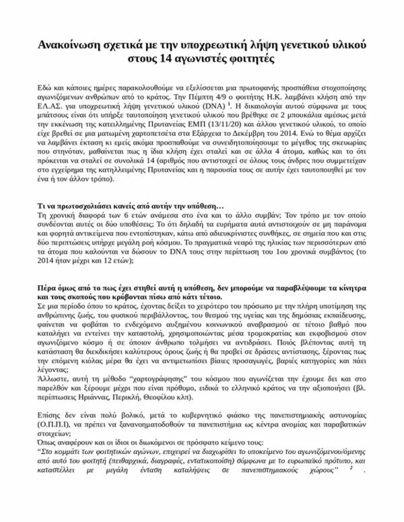 Ανακοίνωση σχετικά με την υποχρεωτική λήψη γενετικού υλικού στους 14 αγωνιστές φοιτητές