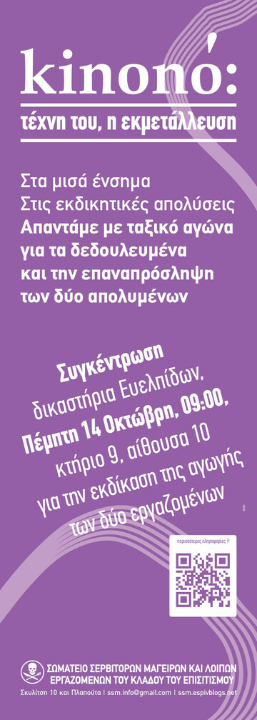Στηρίζουμε τον αγώνα των δύο απολυμένων και καλούμε στα δικαστήρια Ευελπίδων (κτηριο 9, αίθουσα 10), την Πέμπτη 14 Οκτώβρη, στις 09:00.
