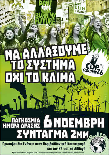 Από τις 31 Οκτώρβη διεξάγεται η Σύνοδος του ΟΗΕ για το Κλίμα (Cop26) στη Γλασκώβη. Το Σάββατο 6 Νοέμβρη εκατομμύρια άνθρωποι θα βγουν στους δρόμους σε όλο το κόσμο διαδηλώνοντας ενάντια στην υπερθέρμανση του πλανήτη και καταστροφή του περιβάλλοντος. Στην Αθήνα, στο Σύνταγμα στις 2 μμ.