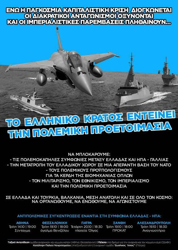 Καλέσματα σε αντιπολεμικές συγκεντρώσεις και κοινή ανακοίνωση συλλογικοτήτων ενάντια στις νέες πολεμικές συμφωνίες μεταξύ Ελλάδας και ΗΠΑ - Γαλλίας