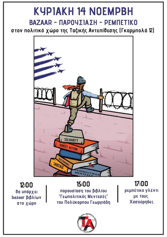 Την Κυριακή 14 Νοεμβρίου θα πραγματοποιηθούν ολοήμερες εκδηλώσεις αλληλεγγύης στον αγωνιστή Πολύκαρπο Γεωργιάδη, ο οποίος δικάζεται στις 6 Δεκεμβρίου 2021, στον πολιτικό χώρο της Ταξικής Αντεπίθεσης Θεσσαλονίκης (Γκαρμπολά 12). Από τις 12.00 θα υπάρχει bazaar βιβλίων, στις 14.00 θα πραγματοποιηθεί η παρουσίαση του βιβλίου "Γεωπολιτικός Μεντεσές" το οποίο έγραψε ο σύντροφος μέσα από τη φυλακή ενώ στις 17.00 θα ξεκινήσει το ρεμπέτικο γλέντι με τους "Χασούρηδες".