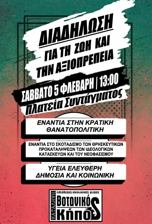 ΔΙΑΔΗΛΩΣΗ Σάββατο 5 Φλεβάρη στις 13.00 στο Σύνταγμα.