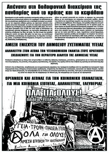 Κυβέρνηση και επιχειρηματίες επιβάλλουν στις «επιτροπές των ειδικών» τα υγειονομικά πρωτόκολλα της πλάκας οδηγώντας στο διαρκές μπάχαλο και τη διαστρέβλωση των επιστημονικών γνώσεων και κατακτήσεων. Το Ε.Σ.Υ. διαλύεται και ιδιωτικοποιείται περαιτέρω αντί να ενισχυθεί με υποδομές και προσλήψεις, οι υγειονομικοί που υπηρετούν το λαό μαχόμενοι την αρρώστια και το θάνατο αντιμετωπίζουν διαρκώς την εξουθένωση και τις απειλές των διορισμένων διοικήσεων, ενώ ο ιδιωτικός τομέας υγείας και οι μεγάλες φαρμακευτικές θησαυρίζουν αντί να έχουν επιταχθεί άνευ όρων προς όφελος της κοινωνίας. Τα media χειραγωγούν διασπείροντας τη σύγχυση και την «ατομική ευθύνη», τα Σώματα Ασφαλείας ενισχύονται για να περιφρουρούν το καθεστώς και να τρομοκρατούν με εκφοβισμούς και πρόστιμα, ενώ αντίθετα τα ΜΜΜ, τα σχολεία και οι σχολές λειτουργούν με ακόμα χειρότερους όρους από πριν.