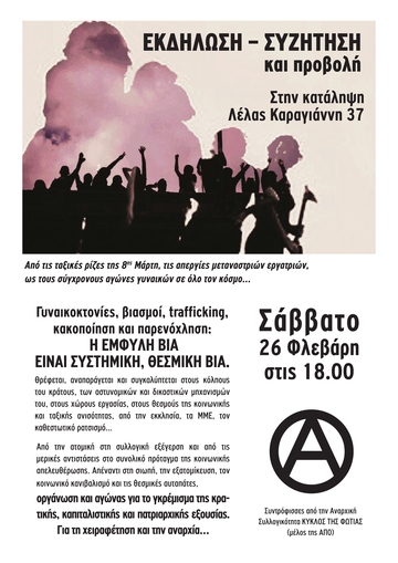 Γυναικοκτονίες, βιασμοί, trafficking, κακοποίηση και παρενόχληση: Η ΕΜΦΥΛΗ ΒΙΑ ΕΙΝΑΙ ΣΥΣΤΗΜΙΚΗ, ΘΕΣΜΙΚΗ ΒΙΑ. Θρέφεται, αναπαράγεται και συγκαλύπτεται στους κόλπους του κράτους, των αστυνομικών και δικαστικών μηχανισμών του, στους χώρους εργασίας, στους θεσμούς της κοινωνικής και ταξικής ανισότητας, από την εκκλησία, τα ΜΜΕ, τον καθεστωτικό ρατσισμό…
